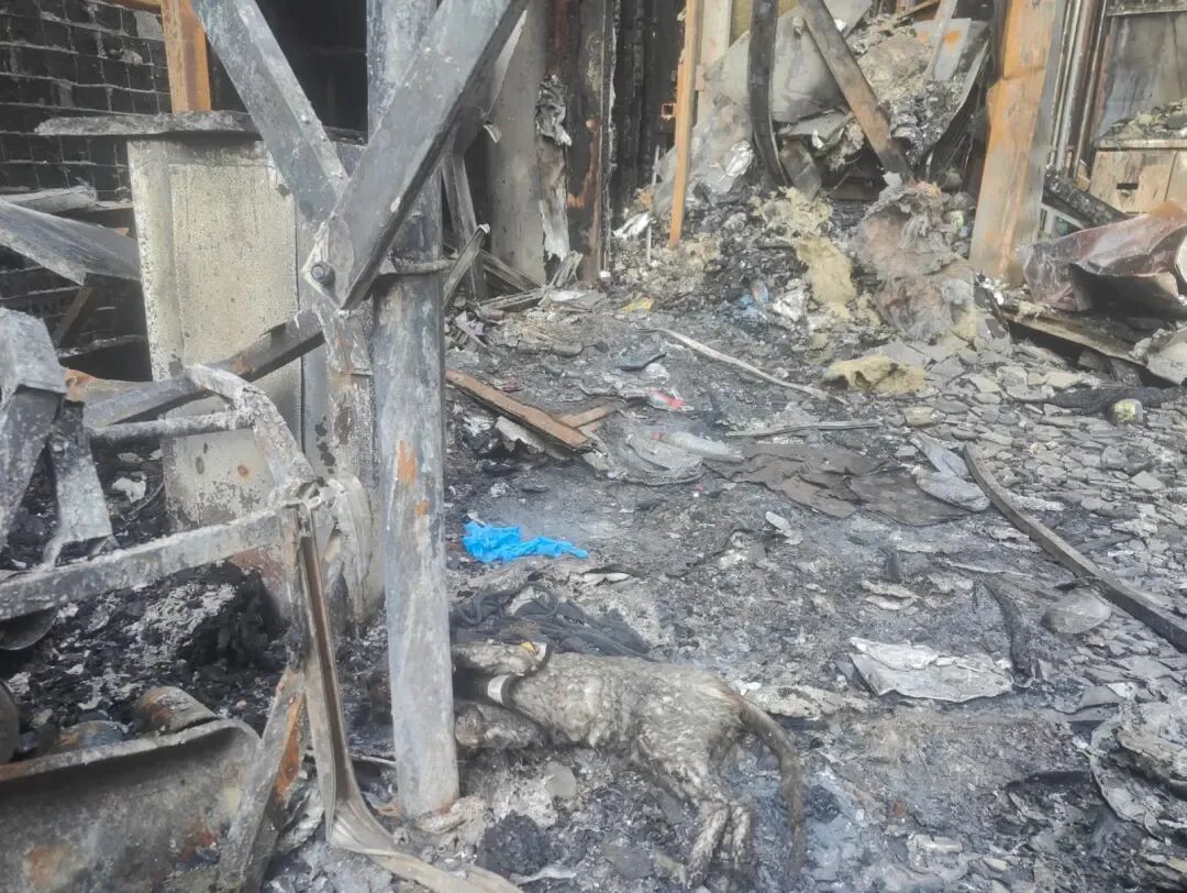 在一家店铺门口,一只未能逃出的小狗还倒在地上。