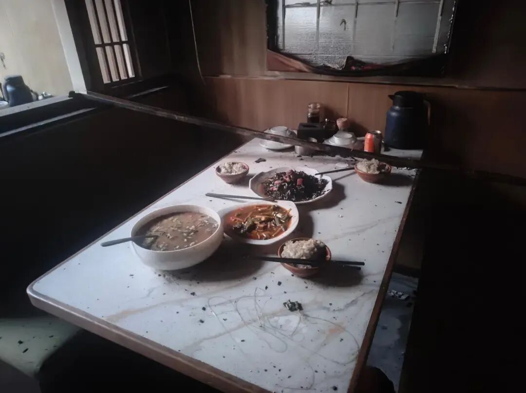 一楼设有十多个卡座,有几桌上还没有吃完的饭菜。一张饭桌上,摆放着三份米饭,几乎还没有动筷子。