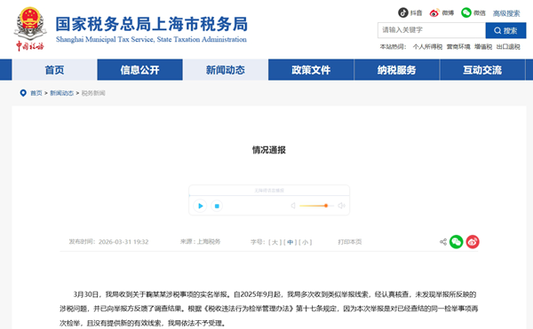 国家税务总局上海市税务局:3月30日,我局收到关于鞠某某涉税事项的实名举报。自2025年9月起,我局多次收到类似举报线索,经认真核查,未发现举报所反映的涉税问题,并已向举报方反馈了调查结果。根据《税收违法行为检举管理办法》第十七条规定,因为本次举报是对已经查结的同一检举事项再次检举,且没有提供新的有效线索,我局依法不予受理。 税务部门将持续加强税收监管,一体推进查处违法、优化执法、促进守法、保护合法,努力营造法治公平的税收环境和诚信纳税的税收生态。感谢社会各界对税收工作的关心支持!