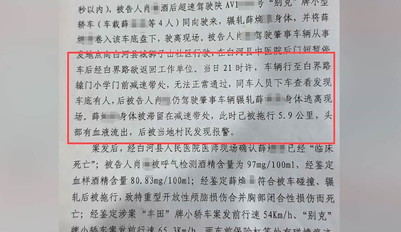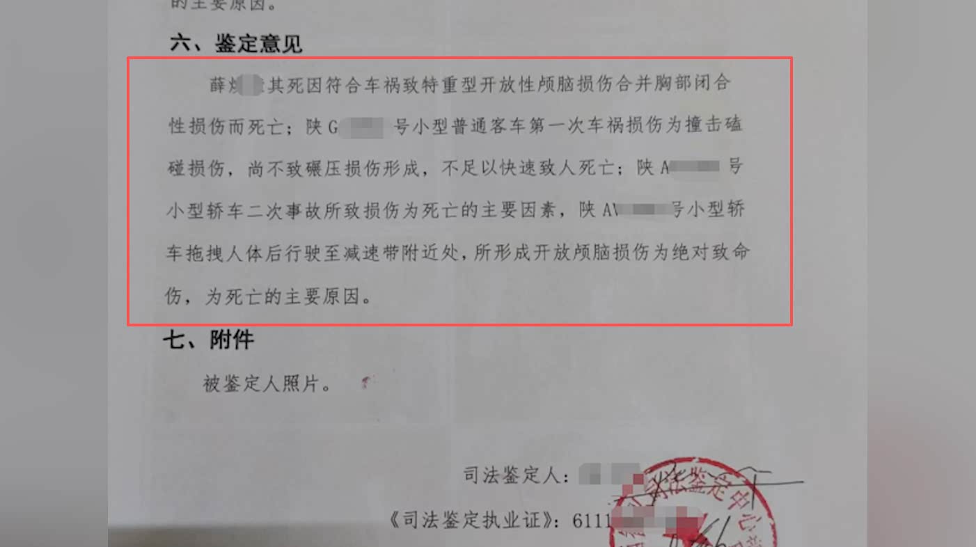 2025年8月,白河县公安局委托陕西智弘司法鉴定中心再次做了鉴定。该份鉴定结果显示:“薛某荣其死因符合车祸致特重型开放性颅脑损伤合并胸部闭合性损伤而死亡;陕G11XXX号小型普通客车第一次车祸损伤……不足以快速致人死亡;陕AV1XX号小型轿车二次事故所致损伤为死亡的主要因素……拖拽人体后行驶至减速带附近处,所形成开放颅脑损伤为绝对致命伤,为死亡的主要原因。”