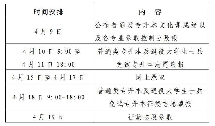 4月15日至4月19日进行普通类专升本和退役大学生士兵免试专升本录取。