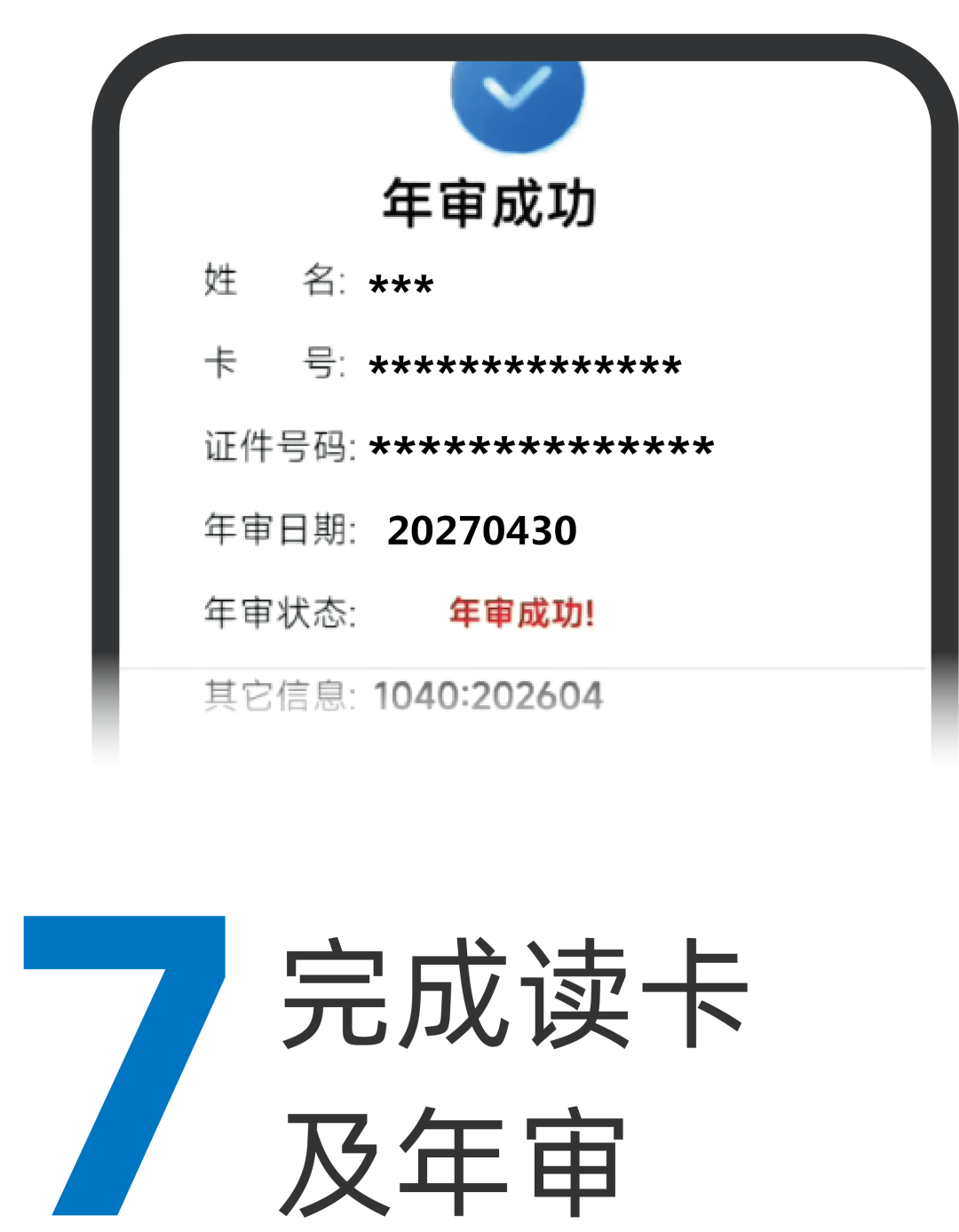 1、目前所有安卓系统手机均能实时操作,功能使用前提前打开手机NFC功能,部分老旧款苹果手机无法操作,苹果手机用户可先操作尝试一下,如无法进行年审,可更换其他方式。