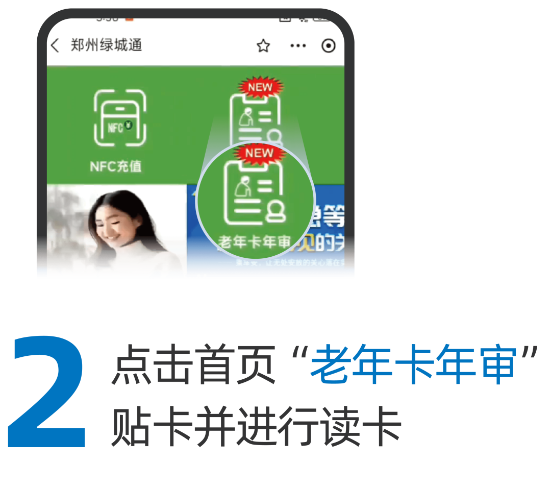 2、点击首页“老年卡年审”,将实体卡贴近NFC感应区,进行读卡