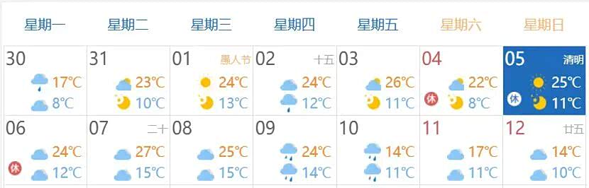 2026年清明假期为4月4日至4月6日,假期期间天气以晴到多云为主,具体气温为4日11~22℃、5日10~28℃、6日9~25℃,伴有偏南风转偏北风,阵风可达4~7级,整体适宜出行,加之高速公路对七座及以下小型客车实行免费通行(免费时间4月4日0时至4月6日24时),预计假期出行流量将大幅攀升。