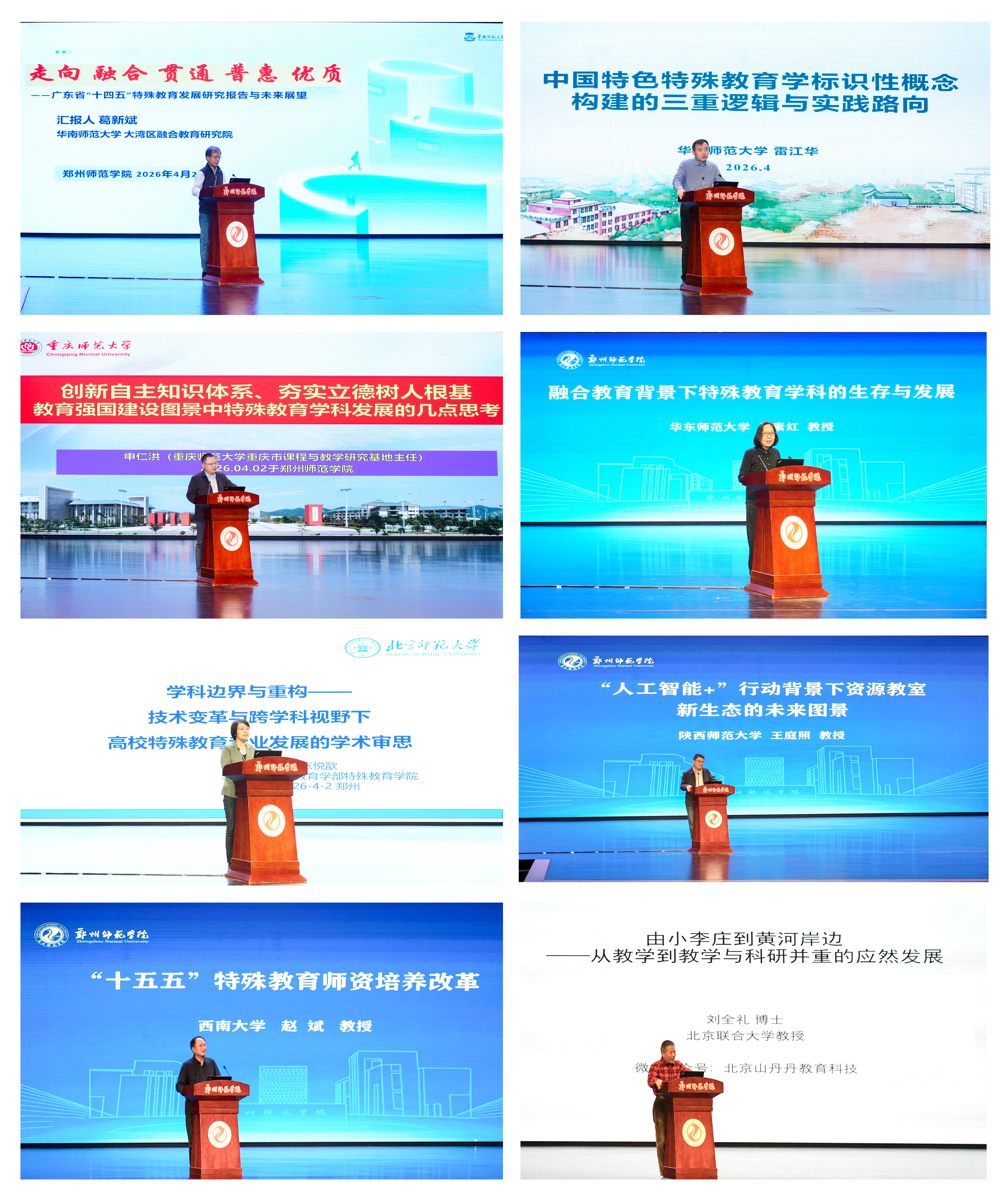 主旨报告阶段,国内特殊教育领域权威专家聚焦学科前沿与发展痛点开展深度研讨。华南师范大学葛新斌教授、华中师范大学雷江华教授、重庆师范大学申仁洪教授、华东师范大学于素红教授、北京师范大学张悦歆教授、陕西师范大学王庭照教授、西南大学赵斌教授、北京联合大学刘全礼教授等八位专家围绕特殊教育学科体系构建、融合教育高质量发展、人工智能与数字化赋能、师资能力结构重塑、课程体系改革、跨学科人才培养等关键议题,系统阐释“融合、贯通、普惠、优质”的发展方向,提出强化理论研究、完善标准体系、深化医教社教协同、创新师资培养机制等一系列前瞻性、指导性思路举措,为新时代特殊教育学科创新发展、服务教育强国建设指明了路径、凝聚了共识。