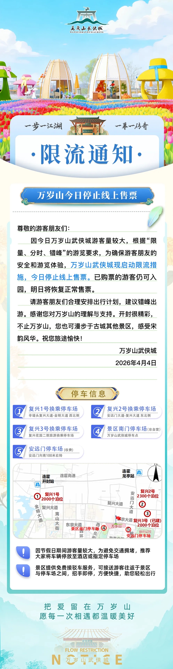 4月4日,万岁山武侠城发布限流通知,具体内容如下: