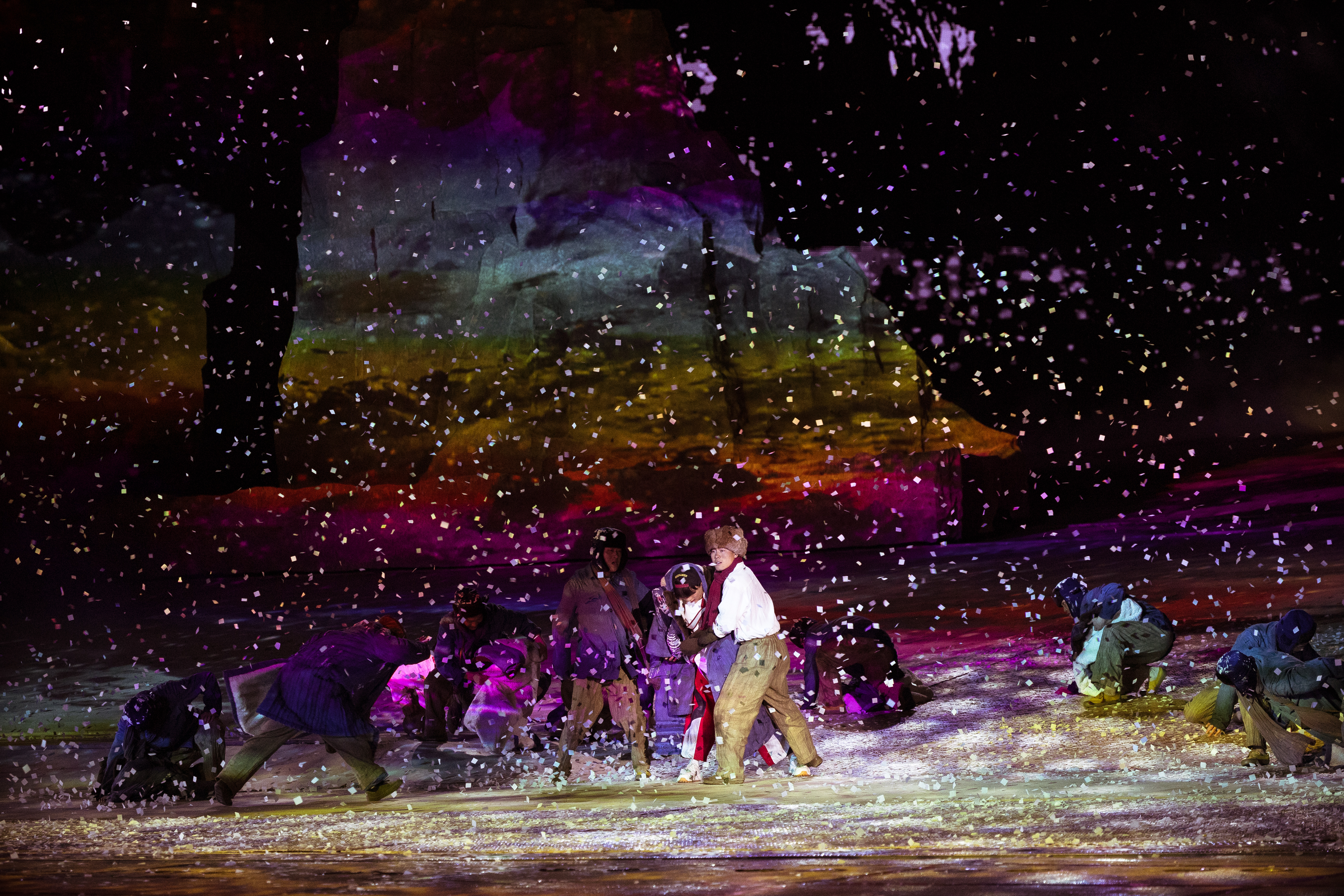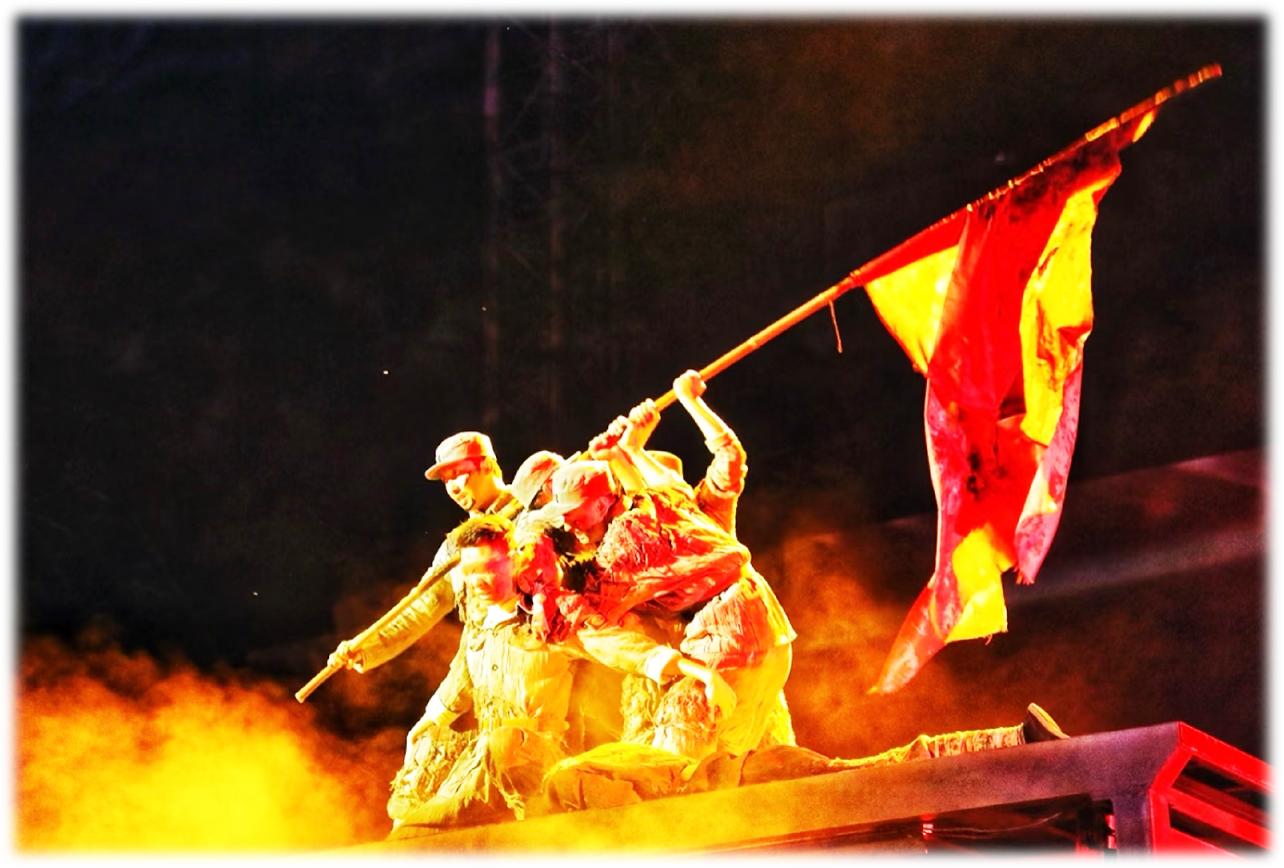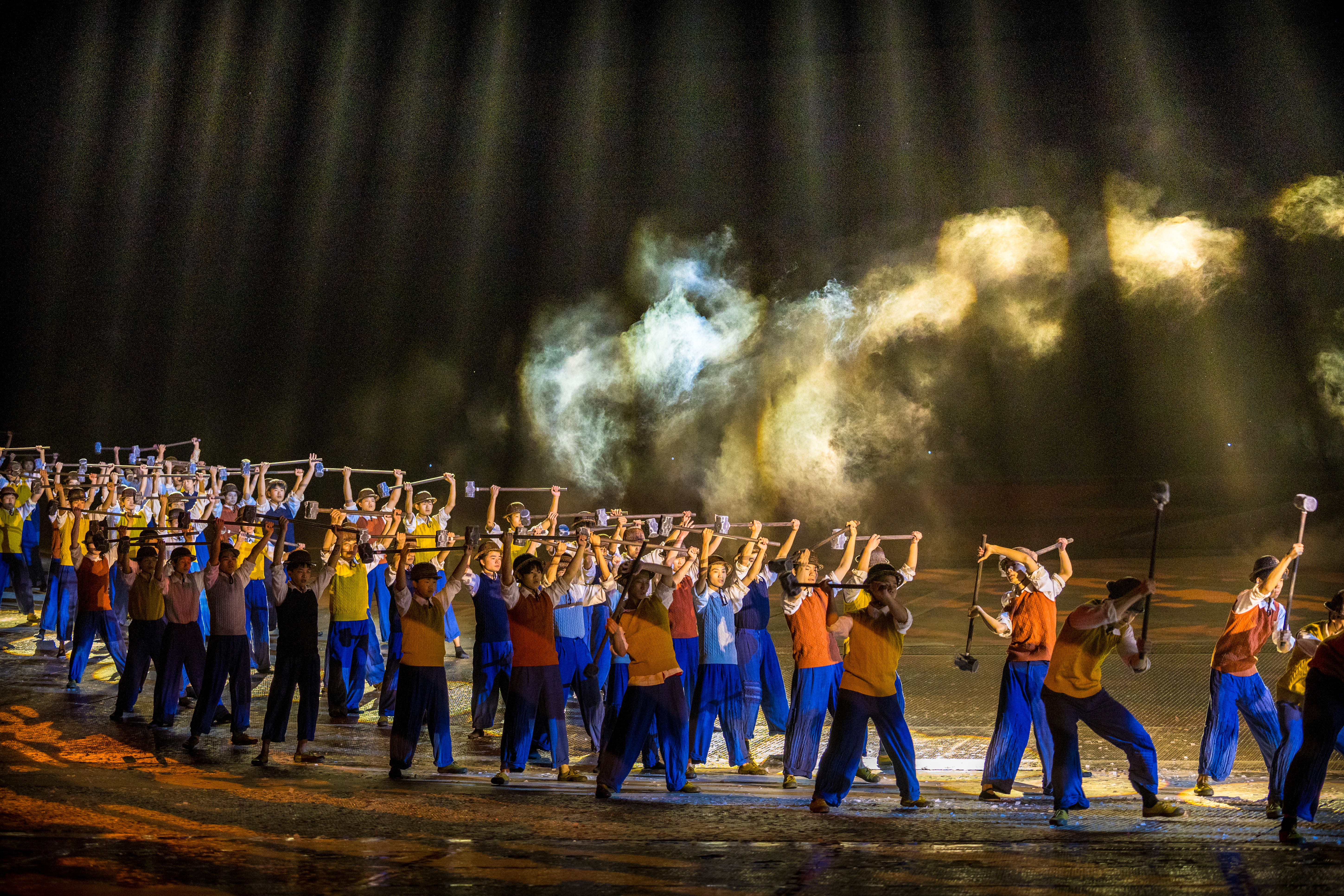 红日冉冉升起,太行山被点亮,金黄色麦田随风摆动,浪漫之极,所有林县的百姓们用人生最豪放的舞步去迎接这场伟大的壮举的成功。舞者们向舞台前区的水域走去,在定叫山河换新装的旋律里,向麦田走去,将水高高扬起,在麦田里挥手……那个美好的明天已来!