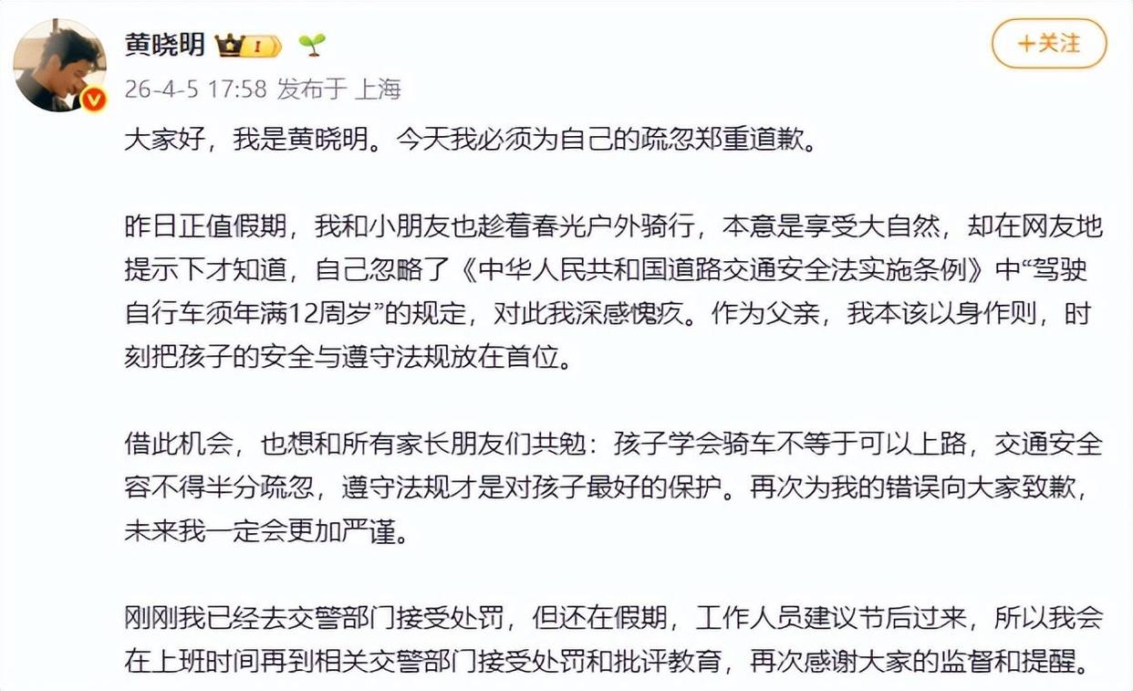 大家好,我是黄晓明。今天我必须为自己的疏忽郑重道歉。昨日正值假期,我和小朋友也趁着春光户外骑行,本意是享受大自然,却在网友地提示下才知道,自己忽略了《中华人民共和国道路交通安全法实施条例》中“驾驶自行车须年满12周岁”的规定,对此我深感愧疚。作为父亲,我本该以身作则,时刻把孩子的安全与遵守法规放在首位。借此机会,也想和所有家长朋友们共勉:孩子学会骑车不等于可以上路,交通安全容不得半分疏忽,遵守法规才是对孩子最好的保护。再次为我的错误向大家致歉,未来我一定会更加严谨。刚刚我已经去交警部门接受处罚,但还在假期,工作人员建议节后过来,所以我会在上班时间再到相关交警部门接受处罚和批评教育,再次感谢大家的监督和提醒。