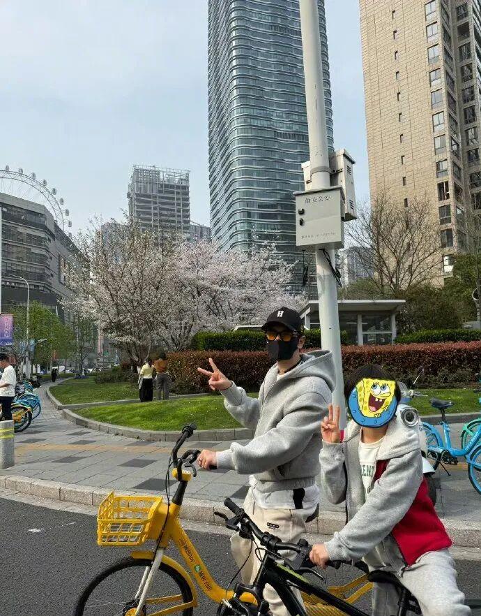 4月4日,黄晓明通过微博发布照片,照片中,他本人骑着共享单车,9岁的儿子则骑着普通儿童自行车,在人行道前击掌、合影。
