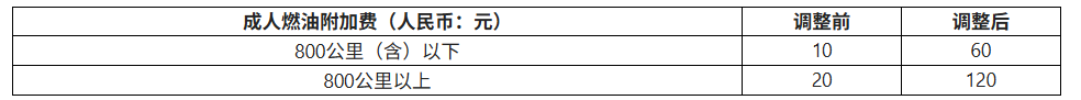 3、按成人全票价的百分之十计价的婴儿免收燃油附加费。