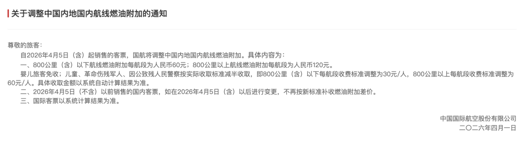 自2026年4月5日(含)起销售的客票,国航将调整中国内地国内航线燃油附加。