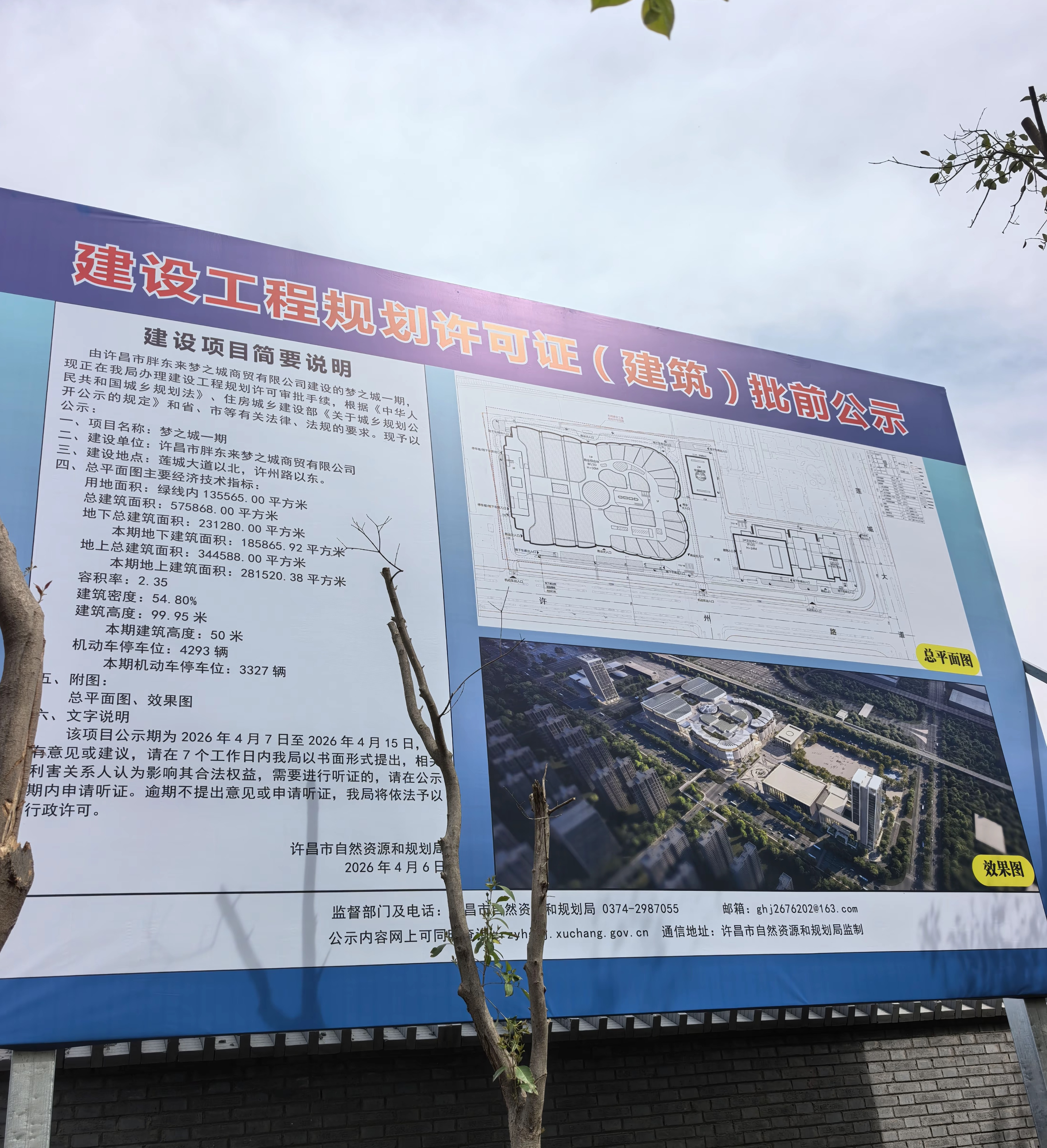 4月7日,大象新闻记者从许昌市自然资源和规划局核实了解到,许昌胖东来梦之城商贸有限公司建设的梦之城一期,已经进入建设工程规划许可证(建筑)批前公示阶段。记者注意到,3月13日,胖东来创始人于东来在其个人社交账号上发布视频称,胖东来梦之城项目“四月动工、2029年9月与大家见面!”