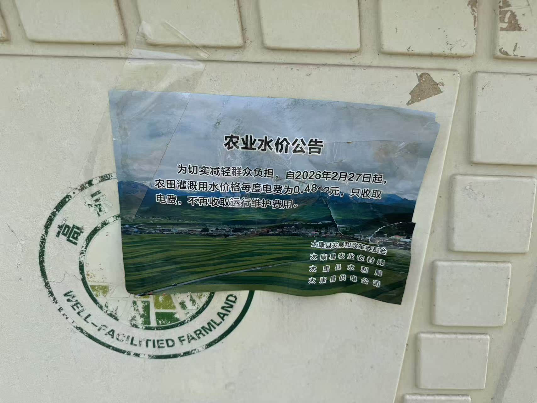 内岗村种粮大户刘海涛说,“你看,这上面说得明明白白,‘为切实减轻群众负担,自2026年2月27日起,农田灌溉用水价格每度电费为0.4842元。只收取电费,不再收取运行维护费用’这张告示的落款是太康县发展和改革委员会、太康县农业农村局、太康县水利局、太康县供电公司。现在都一个多月过去了,我们现在浇地还是0.9元/度,电费一点都没有降。”