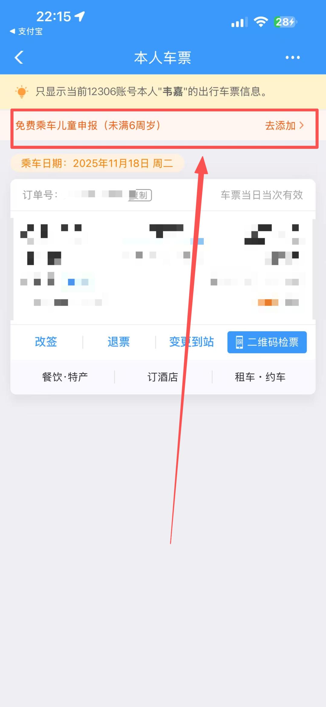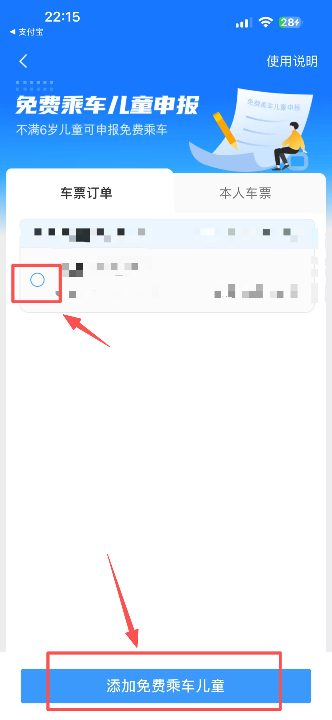 点击【订单】-【本人车票】选择【免费乘车儿童申报】添加免费乘车儿童,如没有儿童信息需点击添加新的免费乘车儿童,按照系统提示完成填写即可。
