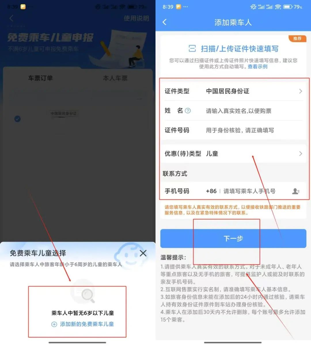 1️⃣未满6周岁且不单独占用席位,可由一名持票成年人旅客免费携带,需在乘车前进行申明。
