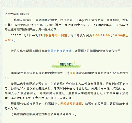 4月9日,记者从洛阳博物馆获悉,为迎接第43届中国洛阳牡丹文化节,更好满足广大游客的参观需求,洛阳博物馆将在2026年牡丹文化节期间实行延时开放。