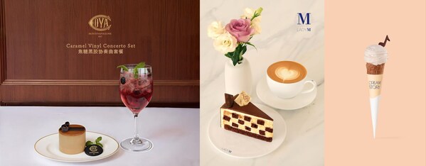 上海恒隆广场“廿五同行,共奏新程”庆典活动场内餐饮品牌音乐主题限定餐食与礼遇(部分)Cova焦糖黑胶协奏曲套餐(左图);LADYM音乐主题限定套餐(中图);CREAMSTORY音符巧克力装饰冰淇淋(右图)