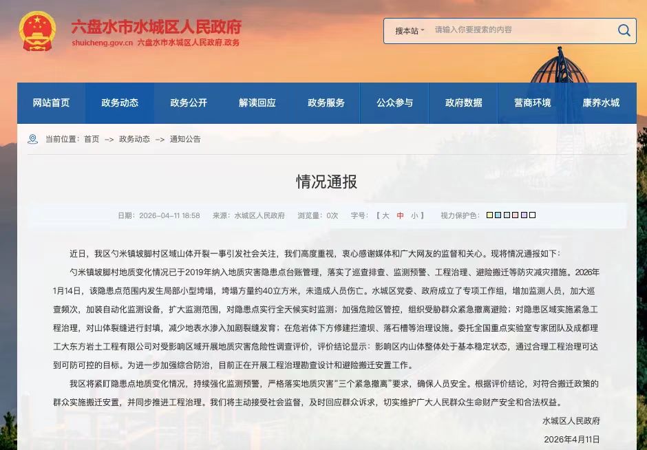 4月11日傍晚,水城区人民政府发布情况通报称,影响区内山体整体处于基本稳定状态,通过合理工程治理可达到可防可控的目标。为进一步加强综合防治,目前正在开展工程治理勘查设计和避险搬迁安置工作。