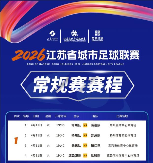 2026江苏省城市足球联赛,即“苏超”于4月11日晚间鸣哨开赛,揭幕战为常州主场对阵南通的比赛。相比2025赛季,本赛季微调为“常规赛单循环+淘汰赛主客场双回合”赛制。
