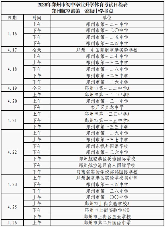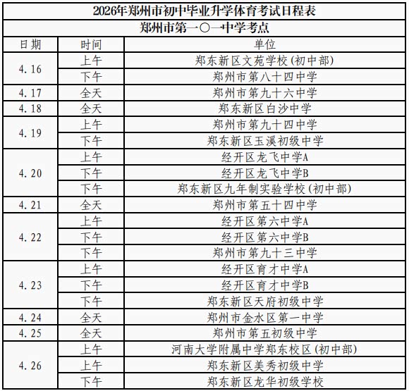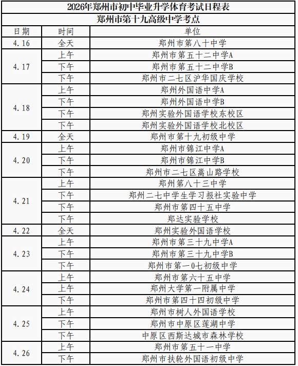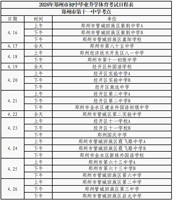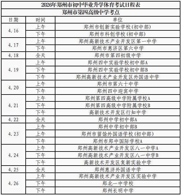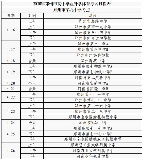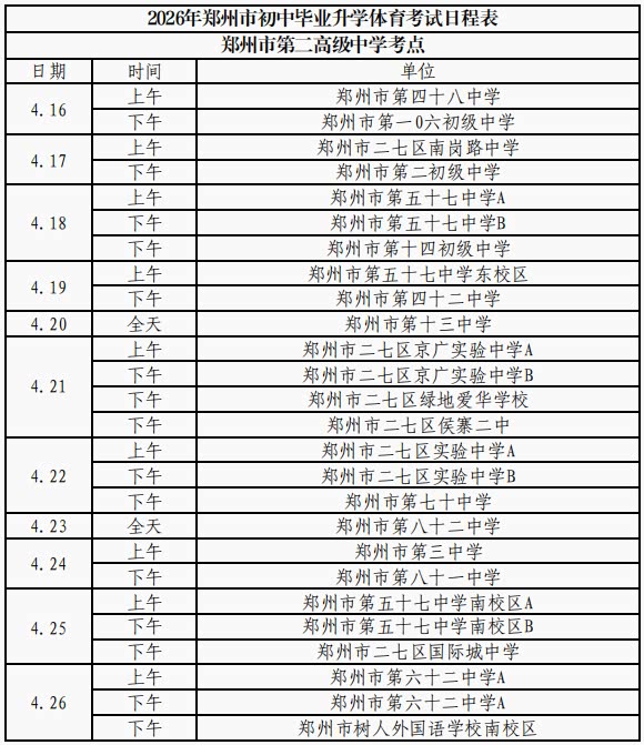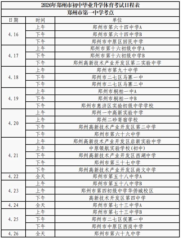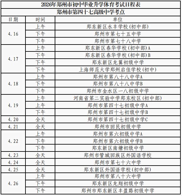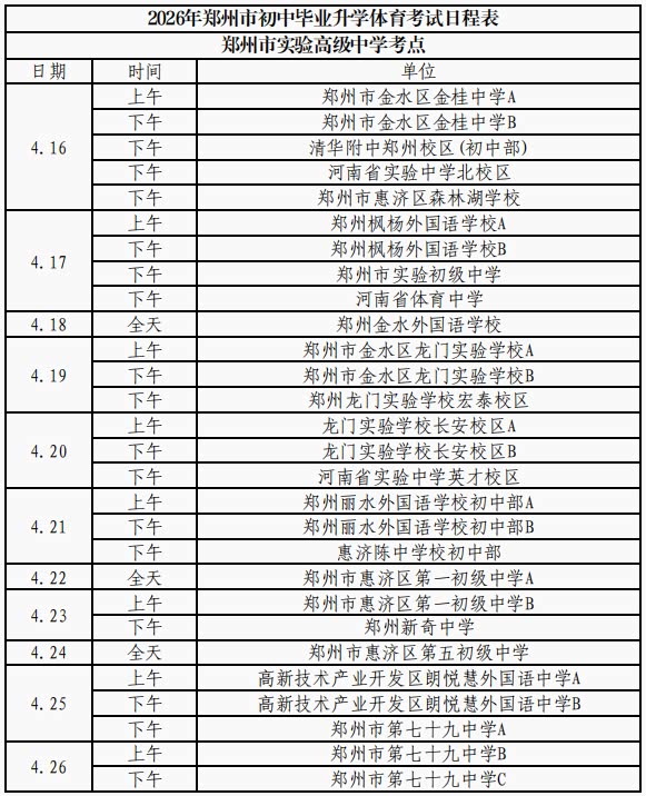 2026年郑州市区初中毕业升学体育考试日程和考点安排表!