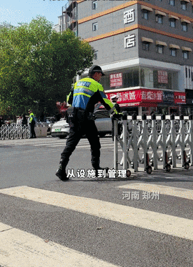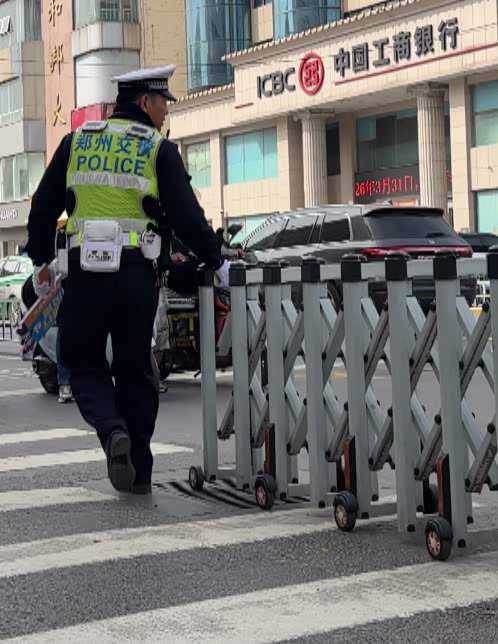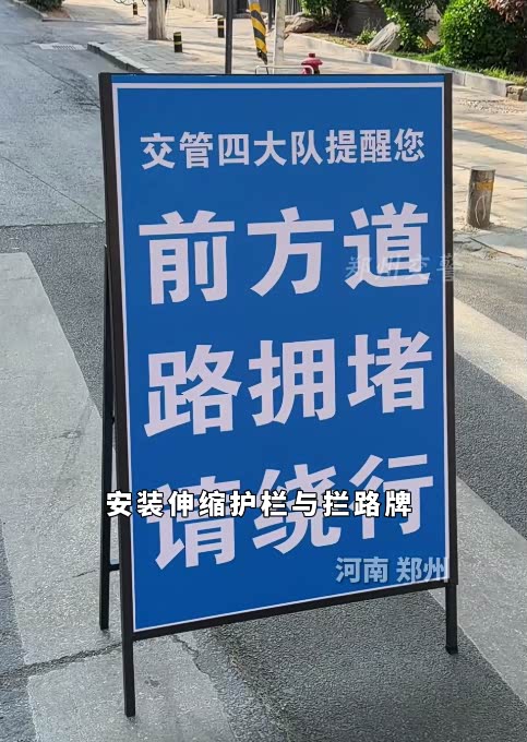 郑州交警在东门区域增设了伸缩护栏、拦路牌及现场指挥小喇叭。伸缩护栏可根据实时交通流量动态调整车道;拦路牌提前警示车辆减速或绕行;小喇叭用于现场语音指挥,提升疏导效率。