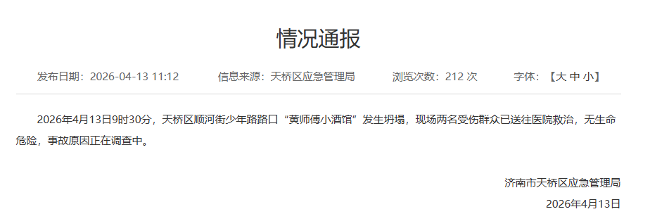 4月13日,济南市天桥区应急管理局发布情况通报:2026年4月13日9时30分,天桥区顺河街少年路路口“黄师傅小酒馆”发生坍塌,现场两名受伤群众已送往医院救治,无生命危险,事故原因正在调查中。