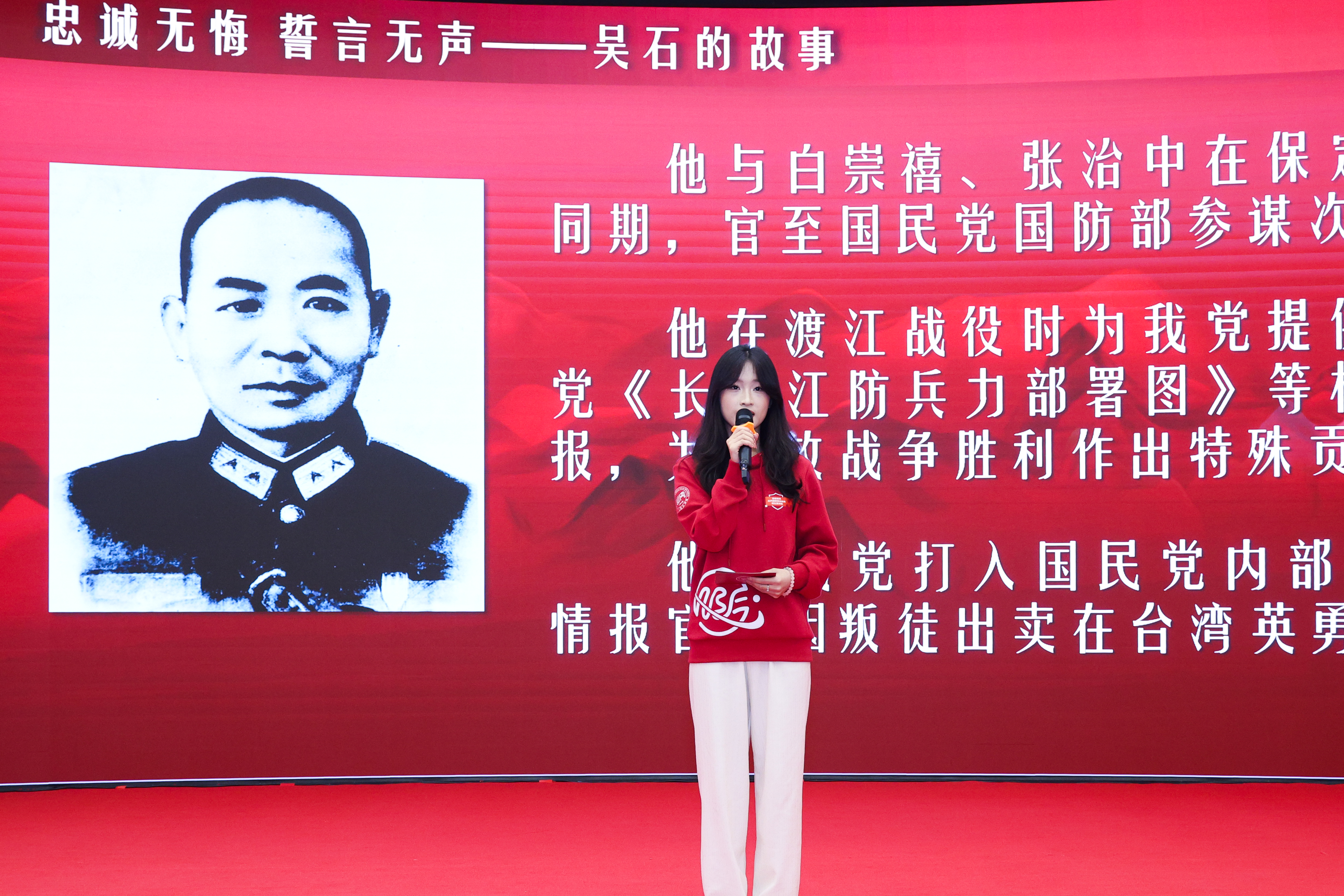 最令人动容的环节,当属讲述隐蔽战线英雄吴石烈士的故事。"若一去不回,便一去不回",宣讲团成员蔡郁馨引用热播谍战剧《沉默的荣耀》中的台词,深情回顾了吴石烈士在台湾潜伏,冒死获取绝密情报,最终英勇就义的壮烈一生。当讲到吴石临刑前从容留下"凭将一掬丹心在,泉下差堪对我翁"的诗句时,现场鸦雀无声,不少同学红了眼眶。