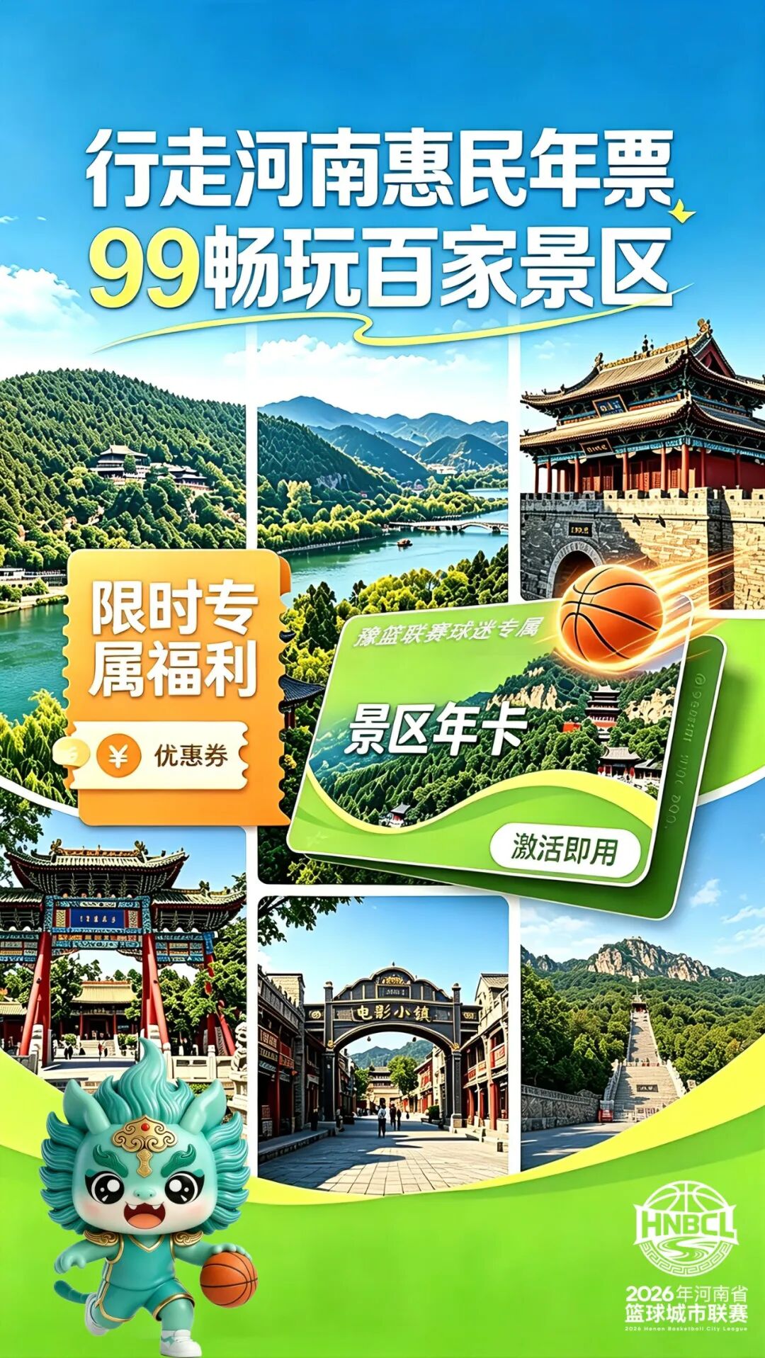 1.凡持有豫篮联赛观赛票的球迷,购买行走河南惠民年票均可享99元专属特惠(原价138元),平均一天不到3毛钱,一卡年票畅玩全省百家A级景区,包含建业电影小镇、太行大峡谷、鸡公山等十八地市各类特色文旅景区及项目。