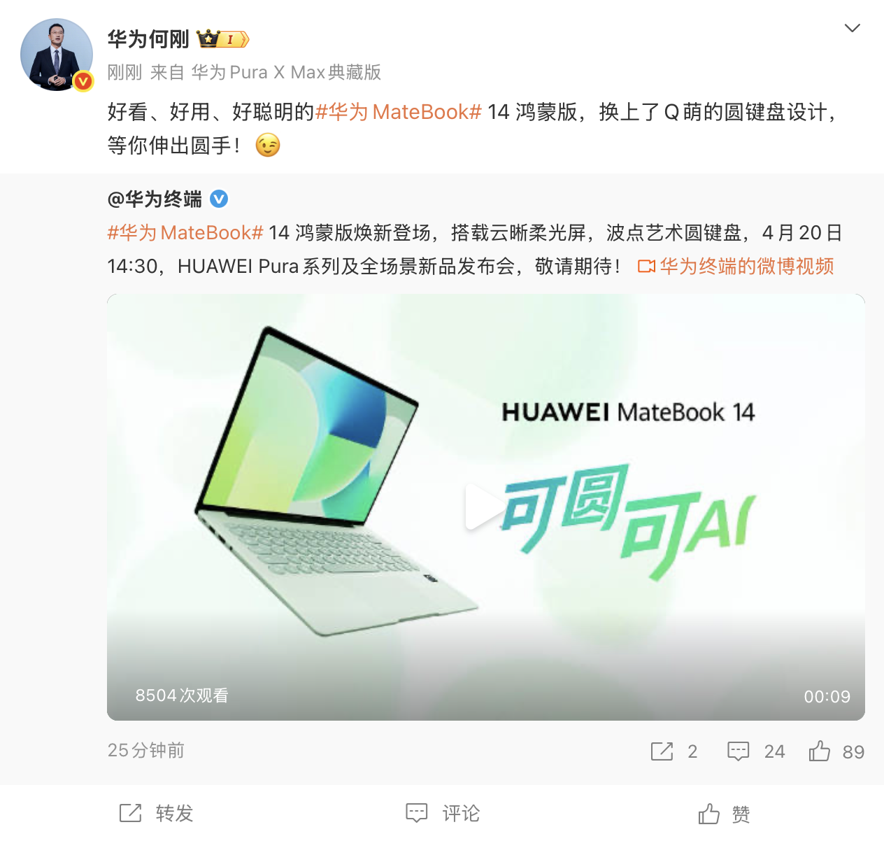 4月14日,华为终端发布新款鸿蒙电脑预热信息,官宣华为MateBook 14鸿蒙版电脑将于4月20日14:30在HUAWEI Pura系列及全场景新品发布会上正式亮相。
