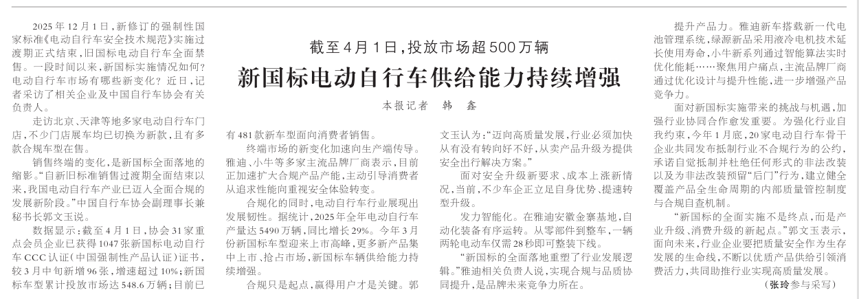 据人民日报消息,2025年12月1日,新修订的《电动自行车安全技术规范》实施过渡期结束,旧国标电动自行车全面禁售,截至2026年4月1日,中国自行车协会31家重点会员企业已获得1047张新国标CCC认证证书,较3月中旬增速超10%,新国标车型累计投放市场达548.6万辆,481款新车型面向消费者销售,供给能力持续增强。据统计,2025年全年电动自行车产量达5490万辆,同比增长29%。