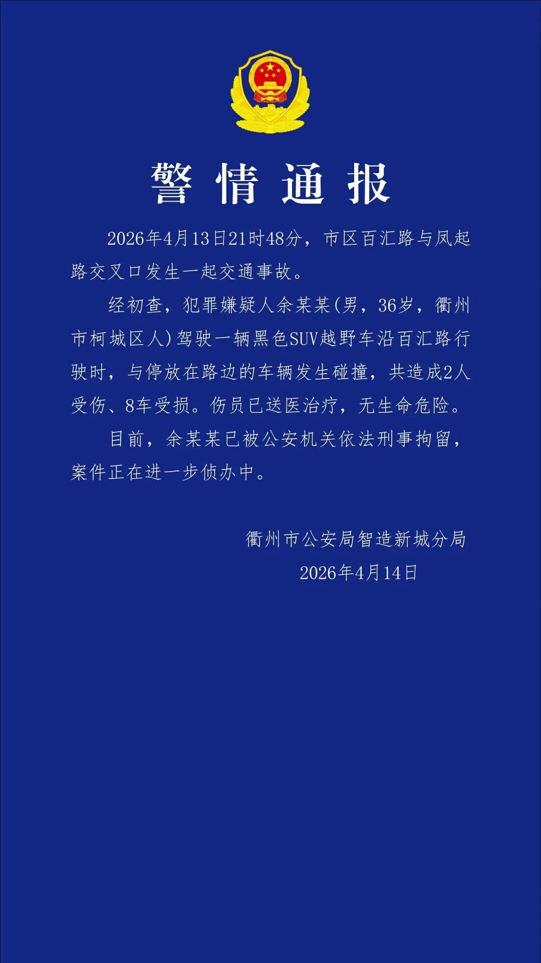4月14日,浙江省衢州市公安局智造新城分局发布警情通报:2026年4月13日21时48分,市区百汇路与凤起路交叉口发生一起交通事故。