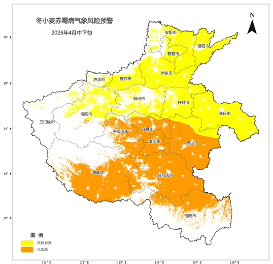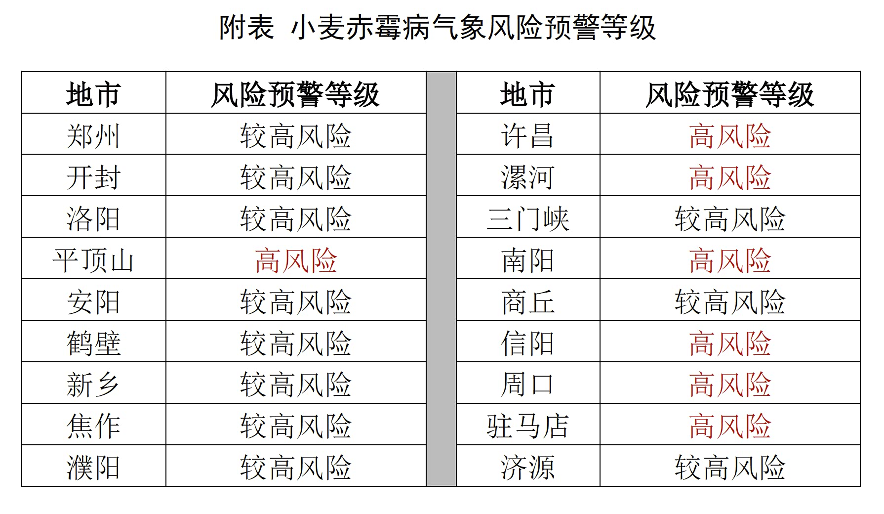 河南省农业农村厅、河南省气象局日前联合发布小麦赤霉病气象风险预警:目前我省大部小麦处于拔节孕穗期,豫南、豫中部分地区进入抽穗期,豫南个别地块已开花。预计4月中下旬我省将出现多轮降水过程,与小麦抽穗扬花期重叠度高,全省大部特别是黄河以南地区存在小麦赤霉病发生流行气象风险,信阳、南阳、驻马店、周口、平顶山、漯河、许昌7市赤霉病发生流行气象风险高,需重点加强防范。