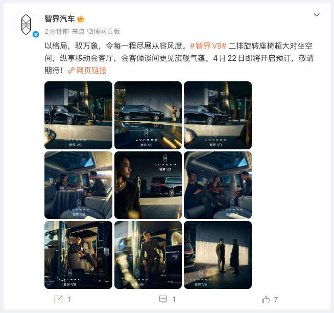 4月15日,鸿蒙智行宣布,首款MPV智界V9将于4月22日发布并开启预订。