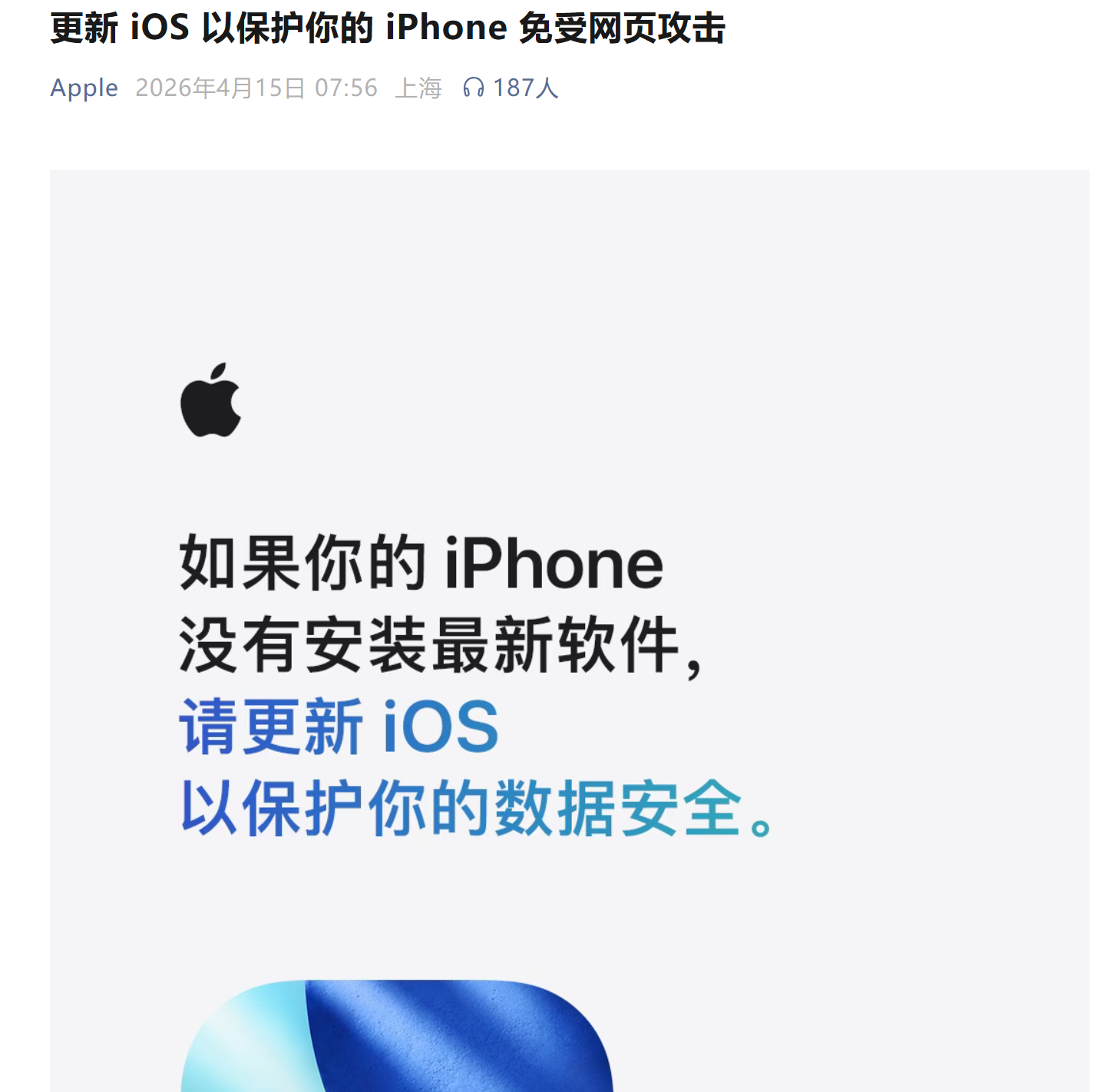 4月15日,苹果官方服务号“Apple”发布《更新iOS 以保护你的iPhone免受网页攻击》提示。
