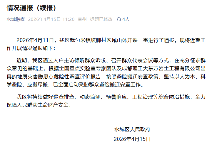 4月15日,六盘水市水城区人民政府发布情况最新通报,明确该区已全面启动勺米镇坡脚村受地质灾害威胁群众的避险搬迁安置工作,持续强化综合防治措施,全力保障群众生命财产安全。此前,该村山体开裂问题经大象新闻报道后引发广泛关注,官方已于4月11日发布首次通报回应相关情况。