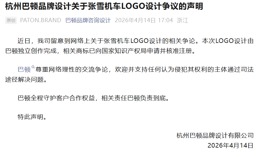 杭州巴顿品牌设计有限公司4月14日发布关于张雪机车LOGO设计争议的声明:本次LOGO设计由巴顿独立创作完成,相关商标已向国家知识产权局申请并核准注册。