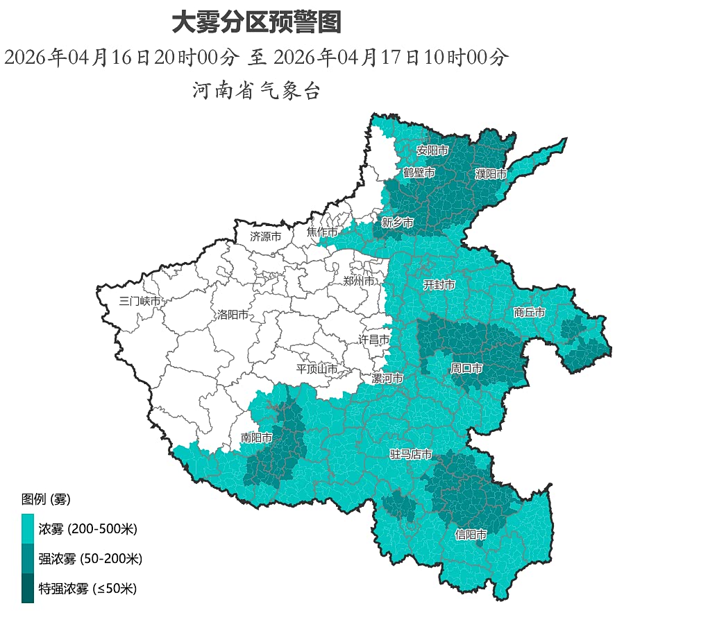 河南省气象台2026年4月16日17时00分发布大雾黄色预警:预计16日20时至17日10时,安阳、鹤壁、濮阳、新乡、焦作中东部、郑州东部、开封、商丘、平顶山南部、许昌东部、漯河、周口、南阳中东部、驻马店、信阳将出现能见度低于500米的浓雾,其中安阳中东部、濮阳、新乡、商丘南部、周口、南阳中东部、驻马店南部、信阳北部部分县(市、区)能见度低于200米,局地低于50米。请注意防范,上述地区的相邻县(市、区)也需关注。