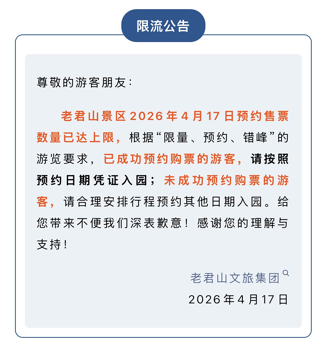 尊敬的游客朋友: 老君山景区2026年4月15日预约售票数量已达上限,根据“限量、预约、错峰”的游览要求,已成功预约购票的游客,请按照预约日期凭证入园;未成功预约购票的游客,请合理安排行程预约其他日期入园。给您带来不便我们深表歉意!感谢您的