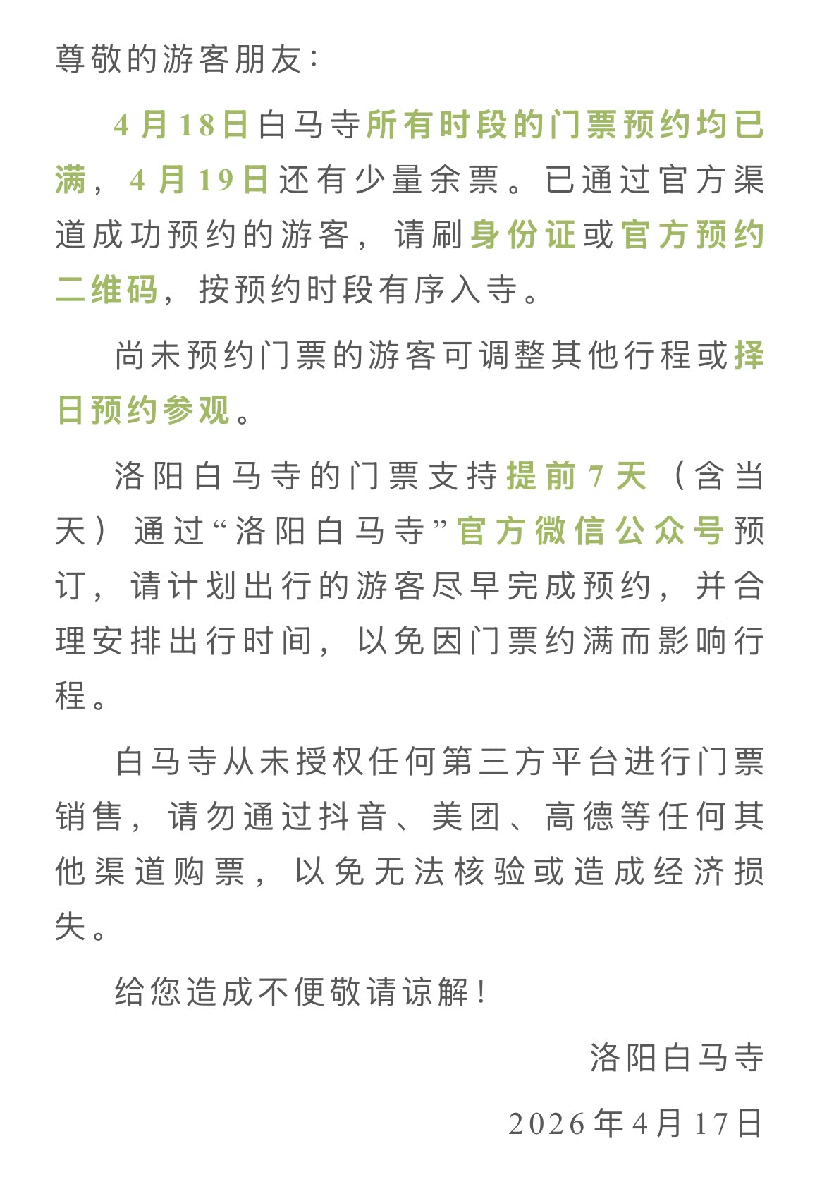 4月17日,记者从洛阳老君山、白马寺景区了解到,由于客流量大,景区已发布限流、预约已满公告,请大家规划好您的行程,并记得出游前先预约!