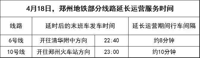 4月17日,记者从郑州地铁获悉,4月18日,郑州地铁部分线路将延长运营服务时间。
