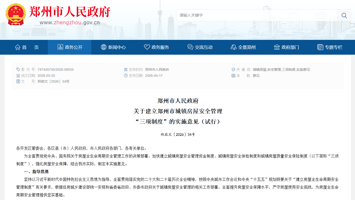 4月17日,郑州市人民政府发布《关于建立郑州市城镇房屋安全管理 “三项制度”的实施意见(试行)》。