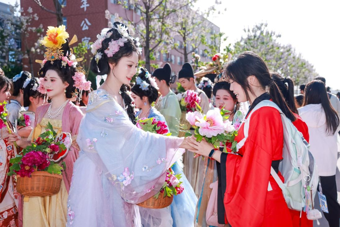 活动当天,洛阳科技职业学院焦桐大道化身流动花海。身着华服的“十二花神”裙裾飞扬,“簪花郎”身姿挺拔,结伴巡游并将万朵牡丹赠予往来学子。