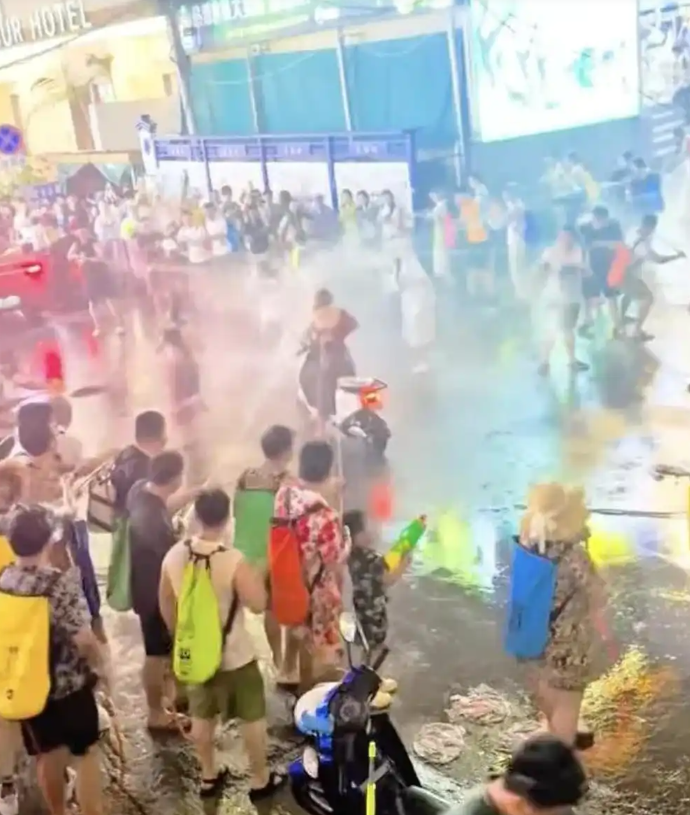 4月13日,有网友通过社交平台发布视频称,近日云南西双版纳泼水节活动,有两名女子在景洪市星光夜市的道路中央,遭到多人使用高压水枪喷射。 视频显示,两名女子骑着电动车,被人群围在路中央,周围的人使用高压水枪向其身上喷水,一女子连连摆手表示拒绝