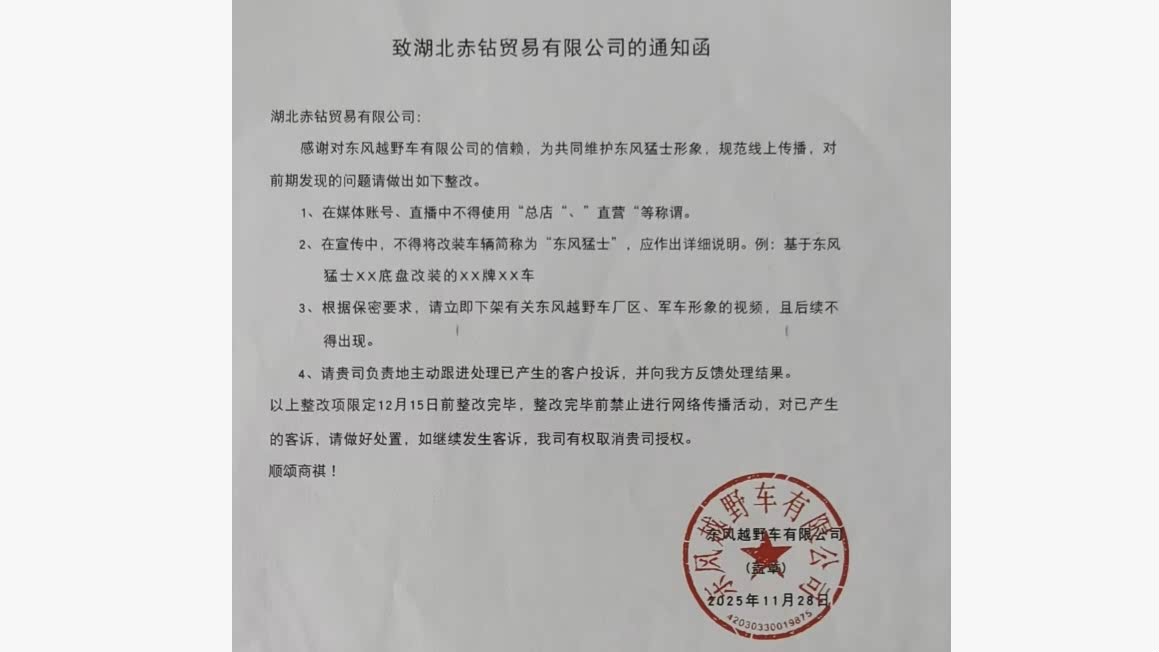 苏先生多次投诉后,2025年11月,东风越野车有限公司向湖北赤钻贸易有限公司发出正式函件,要求其规范线上传播行为。函件中明确指出,该公司在直播中不得使用“总店”“直营”等称谓,宣传中不得将改装车辆简称为“东风猛士”,应对品牌等信息作出详细说明,并立即下架涉及东风越野车厂区、军车形象的相关视频。
