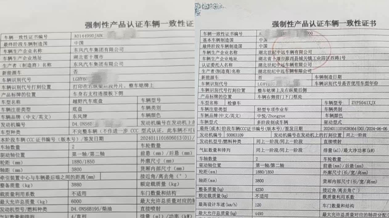 根据苏先生提供的《强制性产品认证车辆一致性证书》,他所购买的是一辆轻型专项作业车。该车辆并非由单一厂家完整制造,而是分为两个部分:一部分是东风汽车集团有限公司生产的越野汽车底盘,另一部分是湖北世纪中远车辆有限公司生产的多阶段制成车辆,两部分组合装配后,最终形成苏先生这辆“中悦牌”猛士逆行者500二类底盘改装整车。