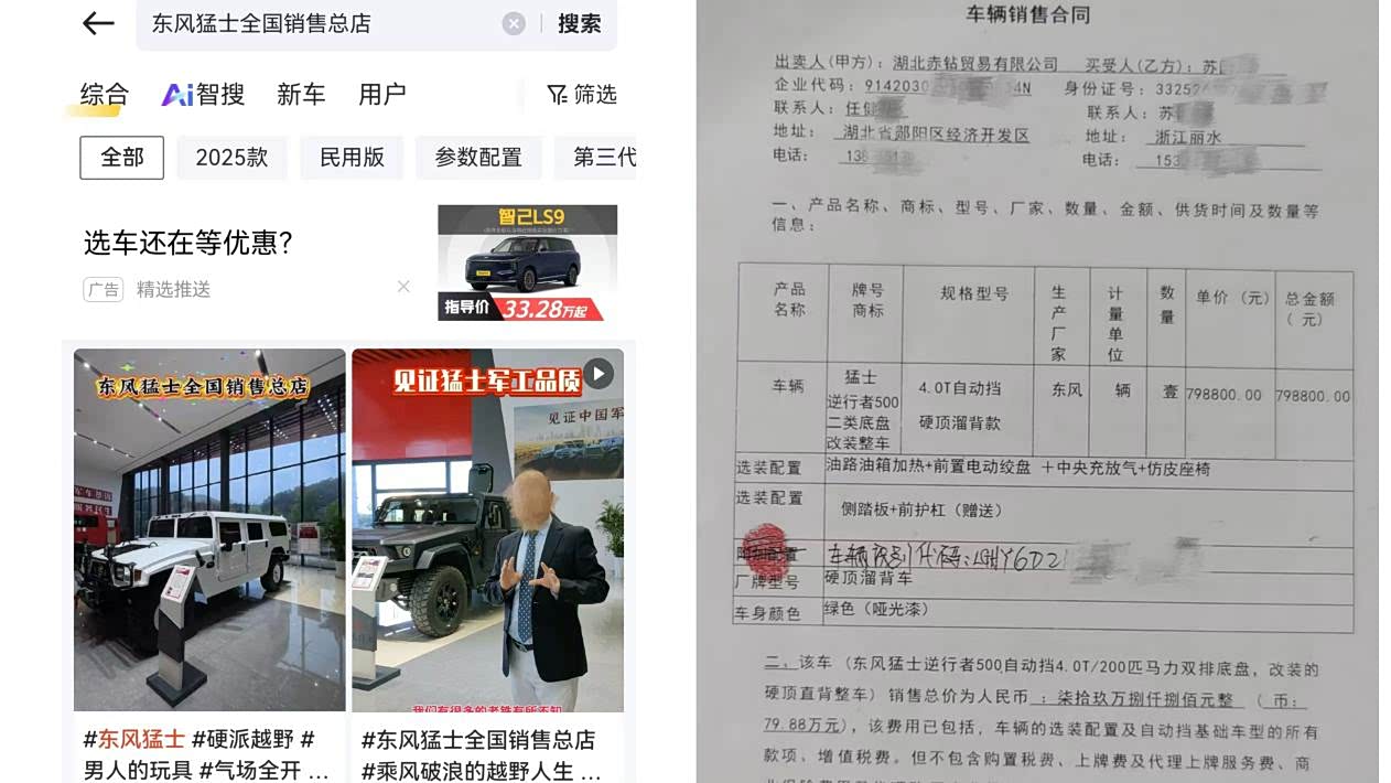 2024年,苏先生在短视频平台搜索“东风猛士全国销售总店”,找到了湖北赤钻贸易有限公司。在与销售人员任某初步沟通后,他于同年12月前往湖北实地看车,并当场支付18000元定金并签订购车合同。合同约定,他以近80万元的价格购买一辆“猛士逆行者500二类底盘改装整车”,合同上明确标注生产厂家为“东风”,通篇未提及“中悦牌”。