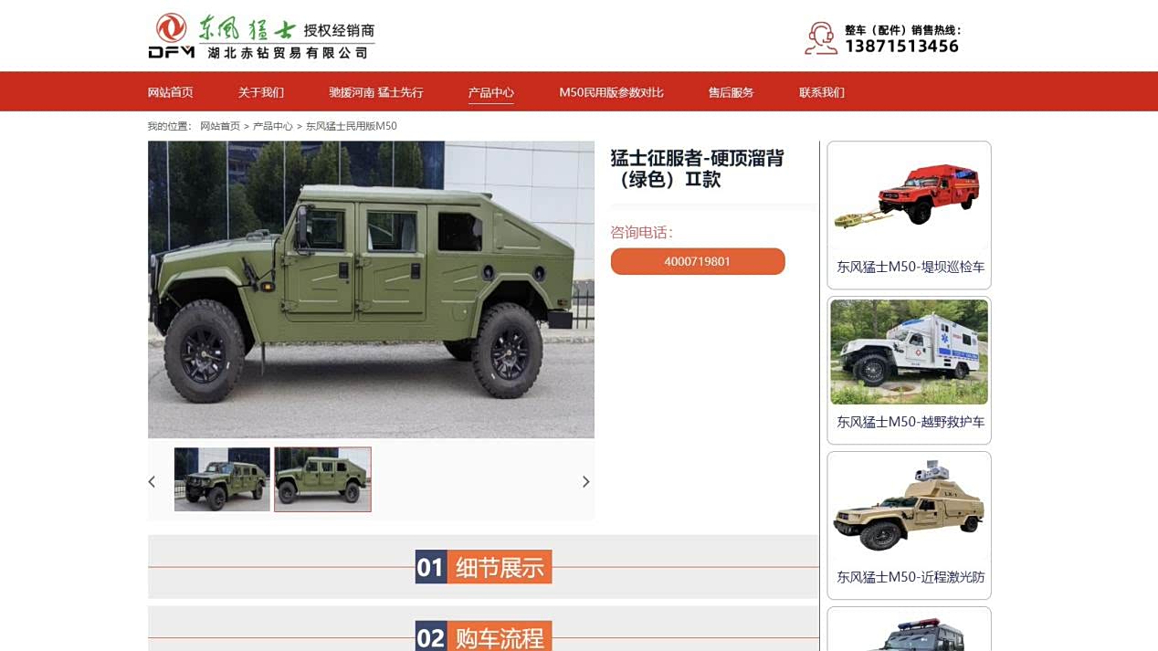 记者在湖北赤钻贸易有限公司的官网上看到,与苏先生车辆外观极其相似的车型被划分在“东风猛士民用版M50”类目下进行展示,页面中并未标注“中悦”品牌信息。