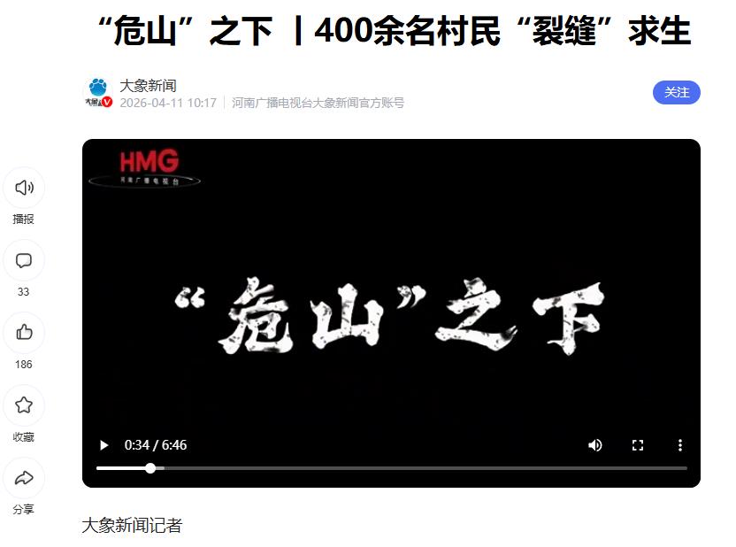 4月11日,大象新闻推出深度报道《“危山”之下丨400余名村民“裂缝”求生》,聚焦坡脚村山体纵横交错的大小裂缝,部分裂缝深不见底,山脚下村民的房屋更是出现墙体开裂、屋顶掉瓦、地面沉降等问题,村民们在地质灾害隐患下的生存现状,迅速引发社会广泛关注。