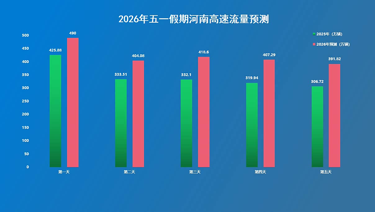 2026年五一小长假共计5天,预计探亲流、旅游流、学生流将呈现“三流叠加”态势,中短途自驾出行仍将是主流出行方式。结合近年五一假期高速公路流量数据及出行规律研判,预计今年五一期间,全省高速公路出口总流量将达到 2100万辆左右,较2025年同比增长10%,日均流量约420万辆,为日常日均流量的2.5倍。其中5月1日单日流量将迎来假期峰值,预计突破490万辆。