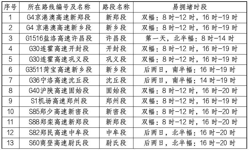 预测可能出现拥堵的路段有:机场高速郑州段、京港澳高速新郑段、京港澳高新乡段、连霍高速开封段、郑少高速新密段、郑民高速中牟段等。
